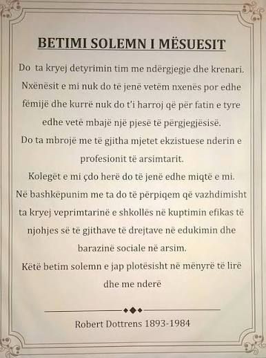 Betohemi në heshtje, betohemi në përulësi, betohemi në punën tonë të përditshme. Betohemi çdo herë që hyjmë në klasë, çdo herë që shohim një fëmijë në sy, çdo herë që vendosim të mos heqim dorë. Dhe ky betim i brendshëm, i padukshëm, i pathënë , është betimi më i shenjtë që kemi.