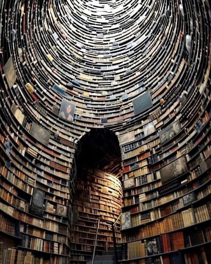 Por aty, mes rafteve, më priste diçka që nuk ishte e zakonshme.”Infinity Book Tower”, kulla e pafund e librave.Në fillim mendova se ishte një instalacion artistik, një ide e bukur për sytë e vizitorëve por sapo u afrova dhe pashë brenda, ndjeva sikur dikush më kishte hapur një dritare drejt mendjes njerëzore. Librat, të vendosur në formë spiraleje, pasqyroheshin pafund në tavan e dysheme.