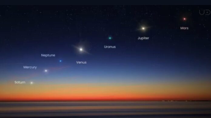 Dhe ka mbrëmje të tjera që hapin perden e qiellit si një skenë teatri kozmik, ku aktorët nuk janë njerëz, por planetë. Më 28 shkurt, horizonti perëndimor nuk do të jetë thjesht fundi i ditës por fillimi i një mrekullie të heshtur. Mërkuri do të shfaqet i ndrojtur, Afërdita me dritën e saj të sigurt, Marsi me nuancën e tij të zjarrtë ndërsa Jupiteri dhe Saturni do të qëndrojnë madhështorë, si dy rojtarë të lashtë të hapësirës. Dhe për ata që do të zgjasin dorën drejt dylbive, edhe Urani do të hyjë në këtë koreografi qiellore, i fshehur por i pranishëm. Nuk është një rreshtim i përkryer në thellësinë e universit por një iluzion i bukur nga këndvështrimi ynë tokësor. Por ndoshta bukuria qëndron pikërisht aty, në faktin se universi, për një çast, zgjedh të duket i harmonizuar për sytë tanë.Ky është një kujtim i heshtur se ne jetojmë brenda një sistemi që lëviz me ritëm të përkryer edhe kur ne ndjehemi të çrregullt se mbi zhurmën e përditshme, ekziston një rend më i madh, një vallëzim i lashtë që vazhdon pa u lodhur. Dilni pas perëndimit. Ngrini sytë.