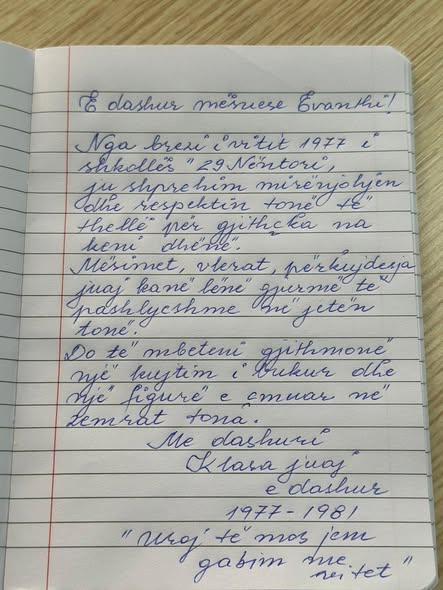 Ne, nxënësit e saj, shpesh qëndronim të mahnitur, duke e vështruar dhe duke u përpjekur ta imitonim, pa u lodhur, me një lloj gëzimi të heshtur që vetëm fëmijëria mund ta kuptojë. Nuk e harroj kurrë atë shkrim, me të cilin dashuroheshim të gjithë. Ajo nuk shkruante thjesht për të dhënë mësim,ajo shkruante për të na mësuar disiplinë,qetësi dhe durim. Çdo gërmë që dilte nga dora e saj dukej aq e gjallë dhe lozonjare sa ne, papritmas, nisëm të shihnim secilën fjalë si një lojë të vogël, një sekret që duhej zbuluar dhe përsëritur. Dhe ja doli që … Moza, Kena, Lela, Vala, Ela, Irina, Gimi, Albana, Elvira, Bona, Vangua, unë….ndoshta të gjithë, pa përjashtim, nisëm të shkruanim si ajo. Çdo shkronjë dhe çdo rresht, ishte një pasqyrim i dashurisë së saj për fëmijët dhe për dijen. Tabela e klasës nuk ishte thjesht një sipërfaqe e zezë por një muze miniature ku gërmat e mësueses sonë Evanthisë, luanin si piktura të vogla. Ne mësuam të krijonim mendim, të ndjenim ritëm dhe të kuptonim se bukuria mund të lindë nga durimi dhe kujdesi. Një fjalë e bukur, një gërmë e rrumbullakosur, një “kërcim” i vogël i shkumësit të bardhë mbi dërrasë dhe mendja jonë ndjente gëzim ndërsa zemrat rrihnin më ngrohtë. Shkrimi i saj nuk ishte thjesht shkronja mbi dërrasë por një gjuhë tjetër, e heshtur dhe e butë, që na mësonte të ndjenim, të imagjinonim dhe të kuptonim se si mund të transformohej dija në diçka të bukur. Ajo na dha më shumë se mësim, ajo na dha një trashëgimi, një mënyrë të të menduari të cilën nuk do ta harrojmë kurrë. Prandaj, le të rikthejmë vëmendjen te shkrimi i dorës. Le të mos e lëmë të zbehet, sepse ai nuk është vetëm një aftësi por një gjuhë, një trashëgimi, një mënyrë për të folur edhe pa fjalë. Ashtu si Mësuese Evanthia na mësoi ne, le të kujdesemi që çdo fëmijë të ketë mundësinë të mësojë të shkruajë bukur, me dashuri dhe durim dhe të ndjejë magjinë e gërmave që flasin për mendje, zemër dhe shpirt. Në këtë rrugë, nisma globale e UNESCO-s për mbrojtjen e shkrimit të dorës vjen si një thirrje e fuqishme për të gjithë ne, që ta ruajmë këtë gjuhë të bukur, të heshtur dhe magjike, ta mbrojmë si trashëgimi arsimore dhe kulturore dhe mbi të gjitha ta përcjellim tek çdo brez i ri, ashtu siç bëri Mësuese Evanthi Kapo me ne.